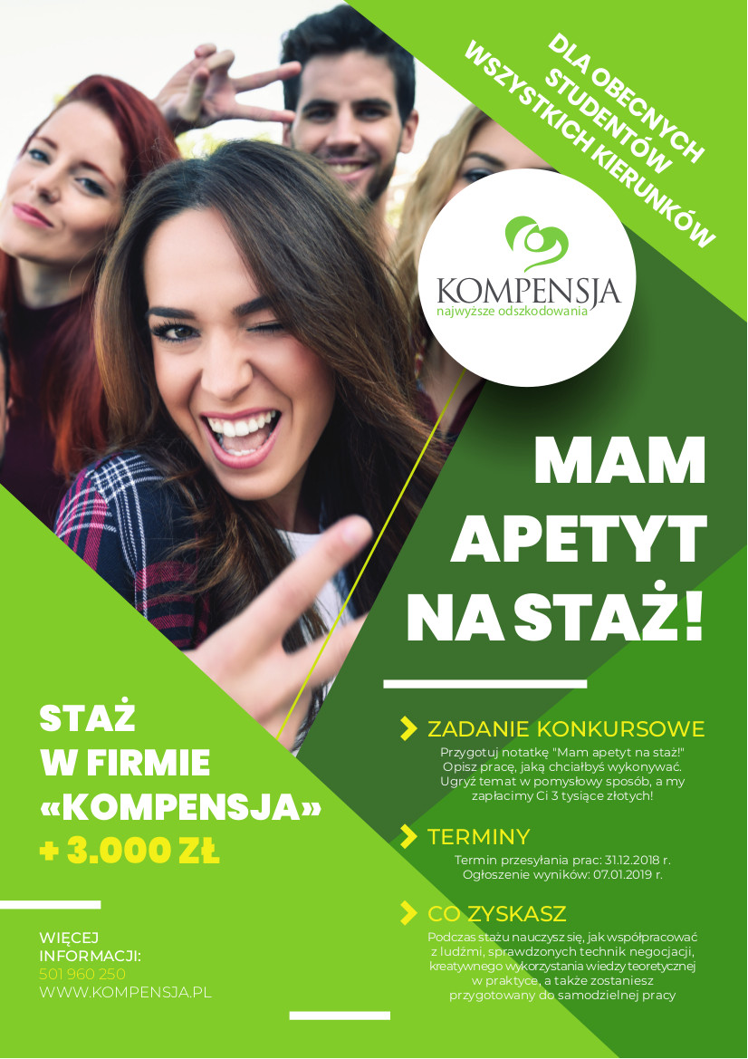 Konkurs organizowany przez Kancelarię Kompensja kierowany jest do studentów. Jego celem jest umożliwienie studentom zdobycia doświadczenia zawodowego oraz pogłębienia i rozwoju swoich zainteresowań, a także nauki współpracy z ludźmi i kreatywnego wykorzystania wiedzy teoretycznej w praktyce. To także szansa na zdobycie trzymiesięcznego stażu i nagrody w wysokości 3000 zł.